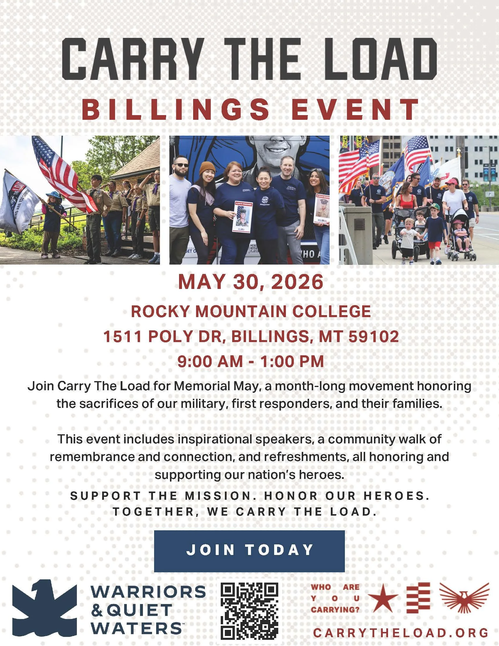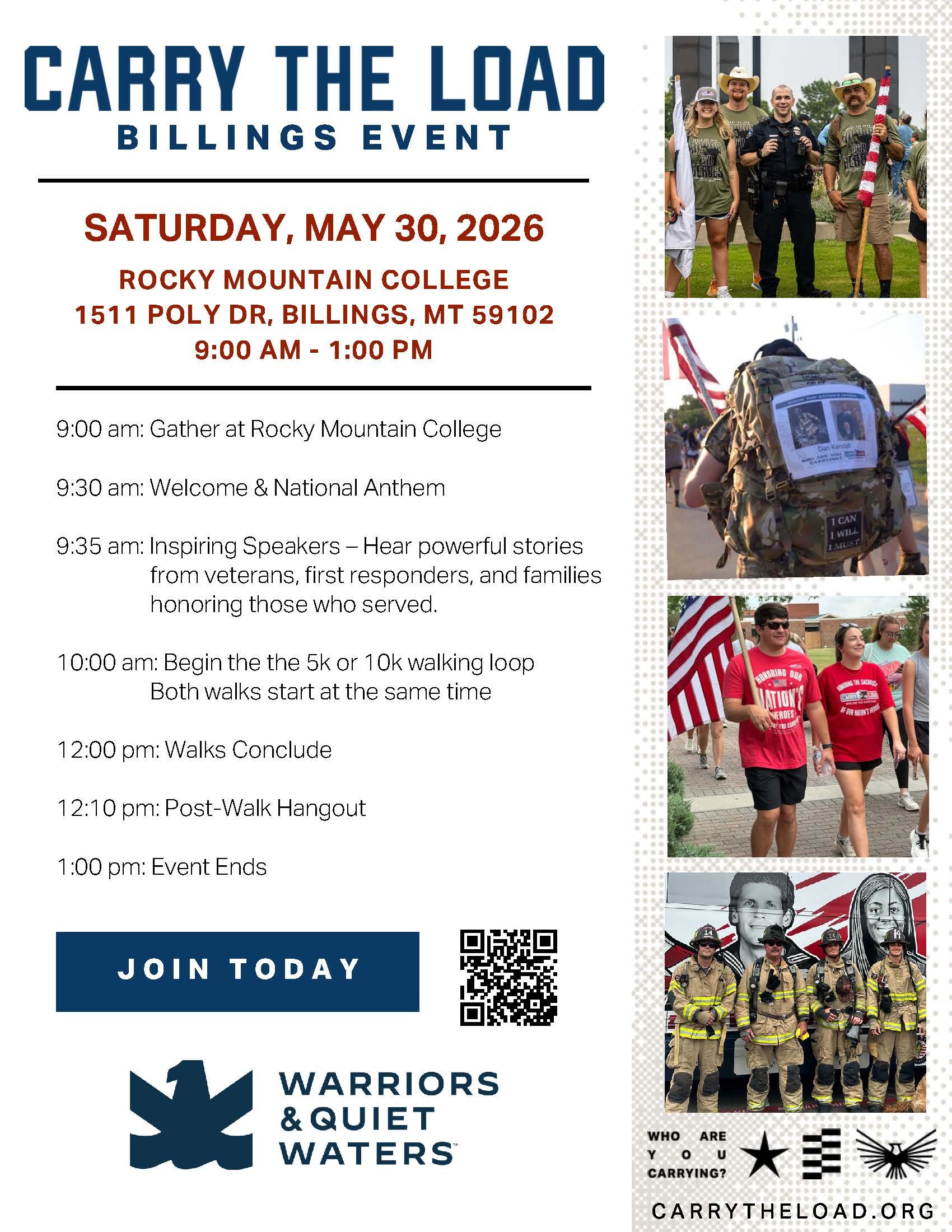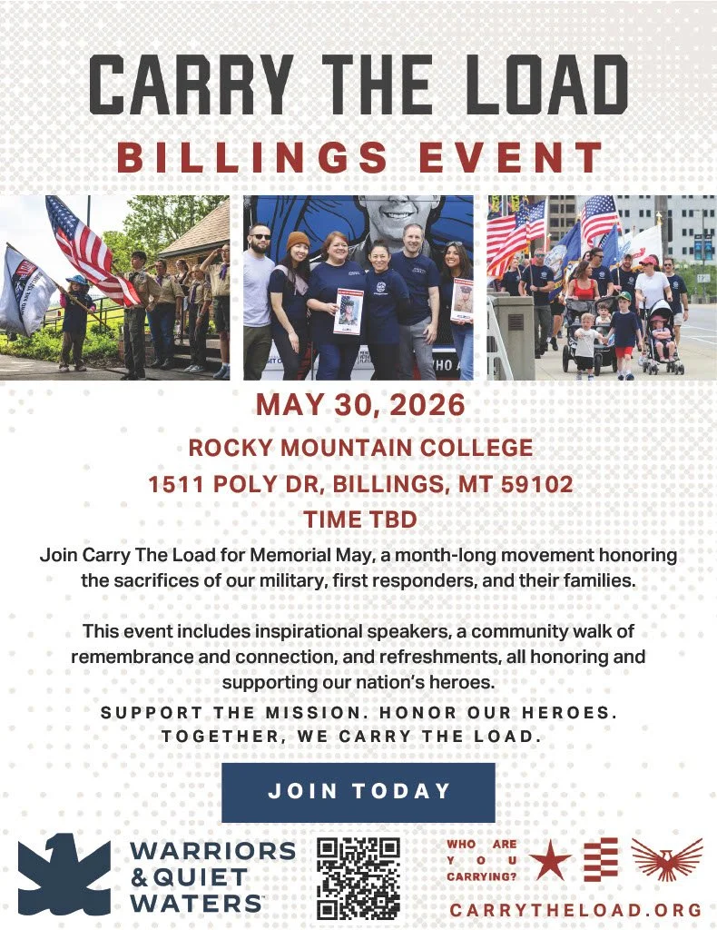 Join the Billings community for Carry The Load on Saturday, May 30, at Rocky Mountain College. This Memorial May event brings people together to honor the sacrifices of our nation’s military members, veterans, first responders, and their families. The day will feature inspiring speakers sharing powerful stories of service and sacrifice, followed by a 5K or 10K community walk that allows participants to reflect, remember, and show support for those who have carried the burden of service. After the walk, attendees are invited to stay for a post-event hangout and connect with others who are committed to honoring our nation’s heroes and strengthening our community.