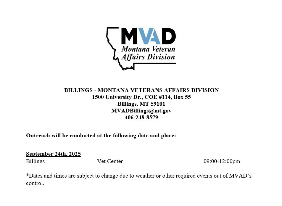 Join the Montana Veteran Affairs Division at the Vet Center in Billings for a Veteran Outreach event, where experts will assist veterans and their surviving spouses with information and guidance on VA claims. Don’t miss this opportunity to connect with dedicated resources to support those who have served.