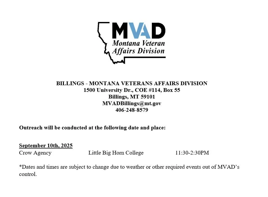 Join the Montana Veteran Affairs Division at Little Big Horn College in Crow Agency for a Veteran Outreach event, where experts will assist veterans and their surviving spouses with information and guidance on VA claims. Don’t miss this opportunity to connect with dedicated resources to support those who have served.
