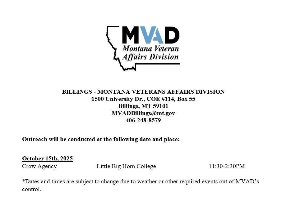 Join the Montana Veteran Affairs Division at Little Big Horn College in Crow Agency for a Veteran Outreach event, where experts will assist veterans and their surviving spouses with information and guidance on VA claims. Don’t miss this opportunity to connect with dedicated resources to support those who have served.