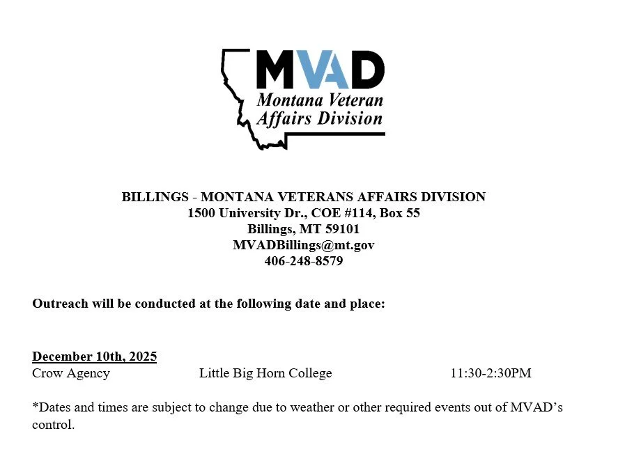 Join the Montana Veteran Affairs Division at Little Big Horn College in Crow Agency for a Veteran Outreach event, where experts will assist veterans and their surviving spouses with information and guidance on VA claims. Don’t miss this opportunity to connect with dedicated resources to support those who have served.