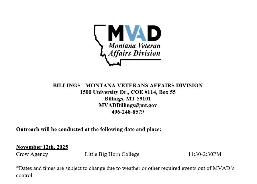 Join the Montana Veteran Affairs Division at Little Big Horn College in Crow Agency for a Veteran Outreach event, where experts will assist veterans and their surviving spouses with information and guidance on VA claims. Don’t miss this opportunity to connect with dedicated resources to support those who have served.