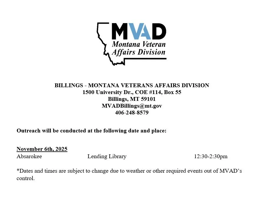Join the Montana Veteran Affairs Division at the Lending Library in Absarokee for a Veteran Outreach event, where experts will assist veterans and their surviving spouses with information and guidance on VA claims. Don’t miss this opportunity to connect with dedicated resources to support those who have served.
