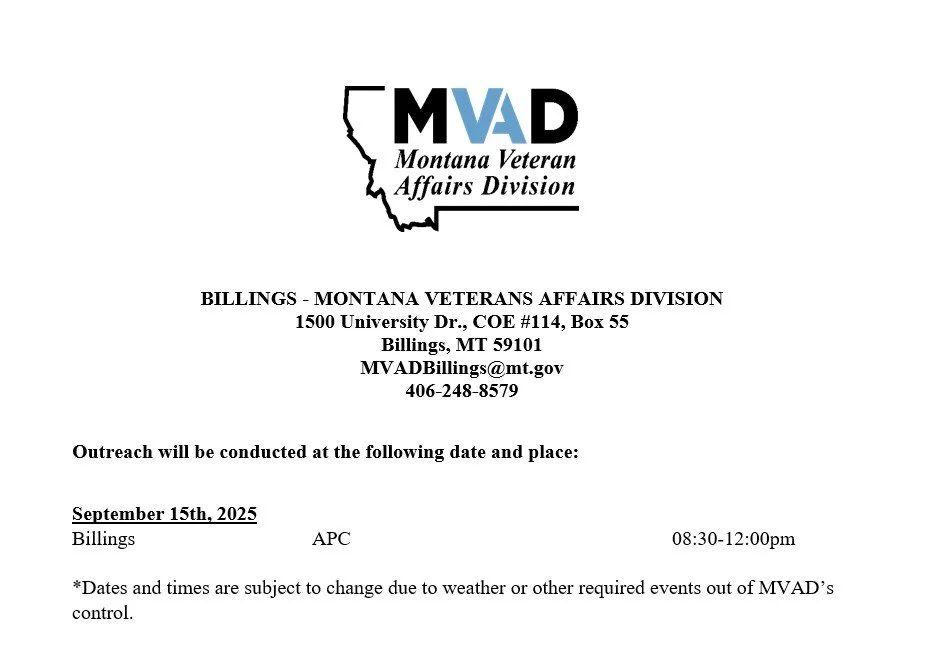 Join the Montana Veteran Affairs Division at APC in Billings for a Veteran Outreach event, where experts will assist veterans and their surviving spouses with information and guidance on VA claims. Don’t miss this opportunity to connect with dedicated resources to support those who have served.