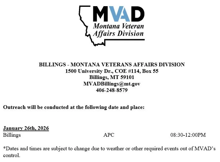 Join the Montana Veteran Affairs Division at APC in Billings for a Veteran Outreach event, where experts will assist veterans and their surviving spouses with information and guidance on VA claims. Don’t miss this opportunity to connect with dedicated resources to support those who have served.