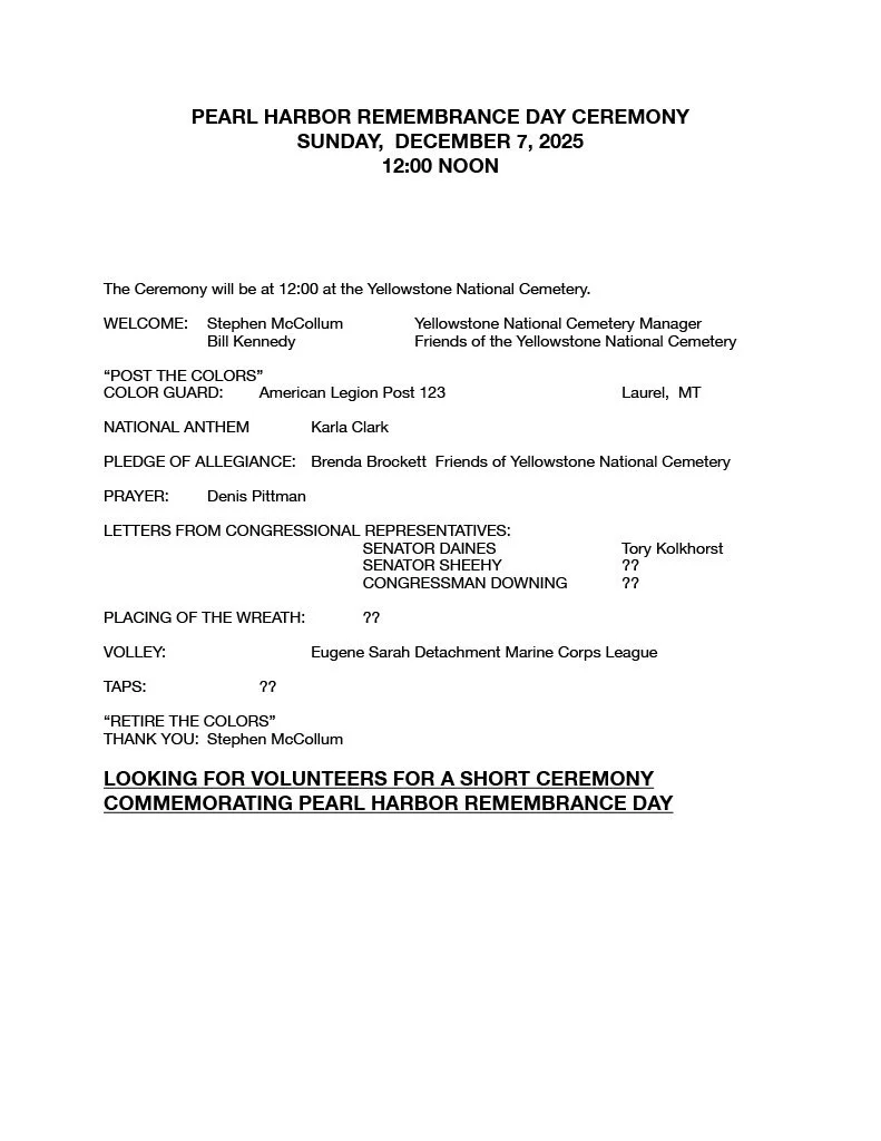 The ceremony will include a welcome from Yellowstone National Cemetery staff and Friends of YNC, presentation of the colors by American Legion Post 123, the National Anthem, Pledge of Allegiance, prayer, congressional letters, wreath placement, a volley by the Marine Corps League, and Taps. Community members are invited to attend as we reflect, remember, and pay tribute.