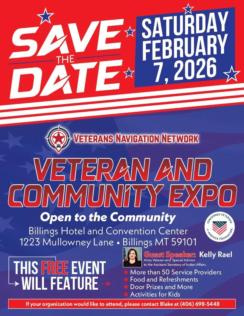 Mark your calendars for the Veteran and Community Expo on Saturday, February 7, at the Billings Hotel and Convention Center. Hosted by VNN, this free community event will feature more than 50 service providers, food and refreshments, door prizes, and activities for kids. Our guest speaker, Kelly Rael, an Army Veteran and Special Advisor to the Assistant Secretary of Indian Affairs, will share her insights and experience. Doors open to the public, so bring your family, connect with resources, and enjoy a day of community connection and support. For details or to have your organization participate, contact Blake at (406) 698-5448.