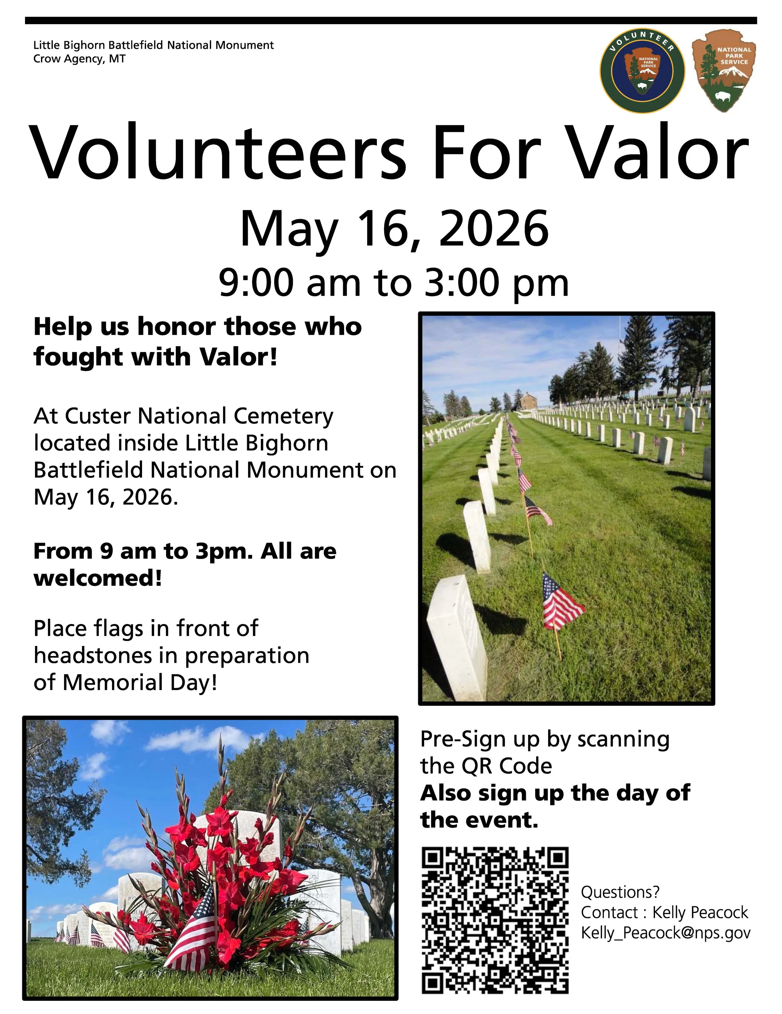 Approximately 5,000 veterans who have served in the Indian Wars, American Civil War, World War I & II, Korean War, and the Vietnam War, now lay to rest in the Custer National Cemetery, located on the grounds of Little Bighorn Battlefield National Monument. To honor the fallen service members for Memorial Day, volunteers will place American flags at each of the 5,000 headstones in the Custer National Cemetery the week before.